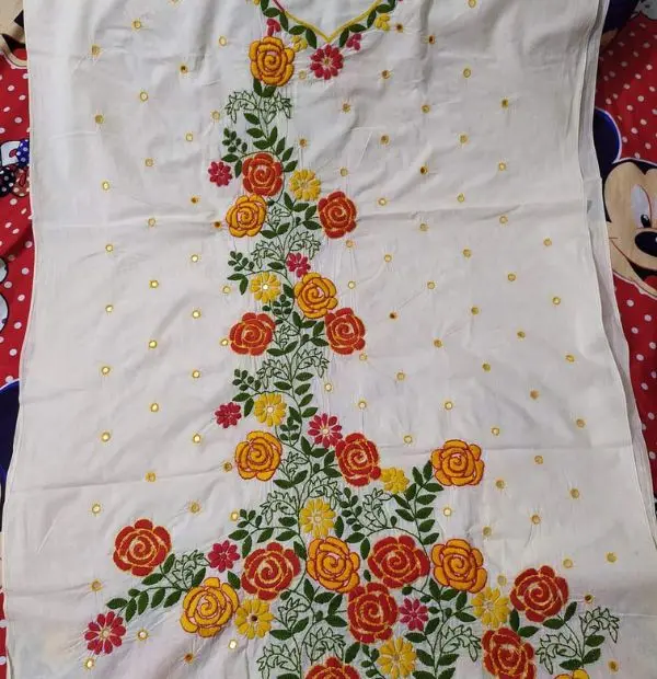 হাতের কাজের ওয়ান পিস। ১০০% কাপড় কোয়ালিটি ভালো। Description : কাপড় : ভয়েল। জামা: সোয়া তিন গজ কাপড়। ওড়না এবং পায়জামা : আড়াই গজ কাপড়।